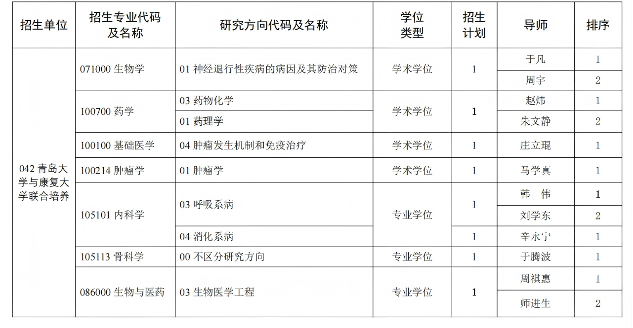康复大学-青岛大学2026年博士研究生招生专业目录